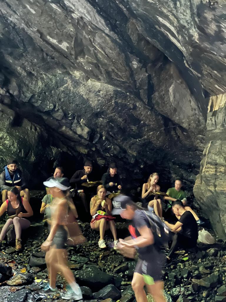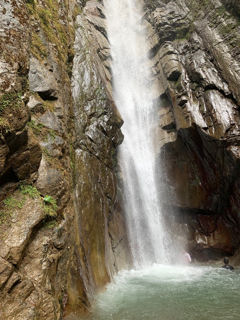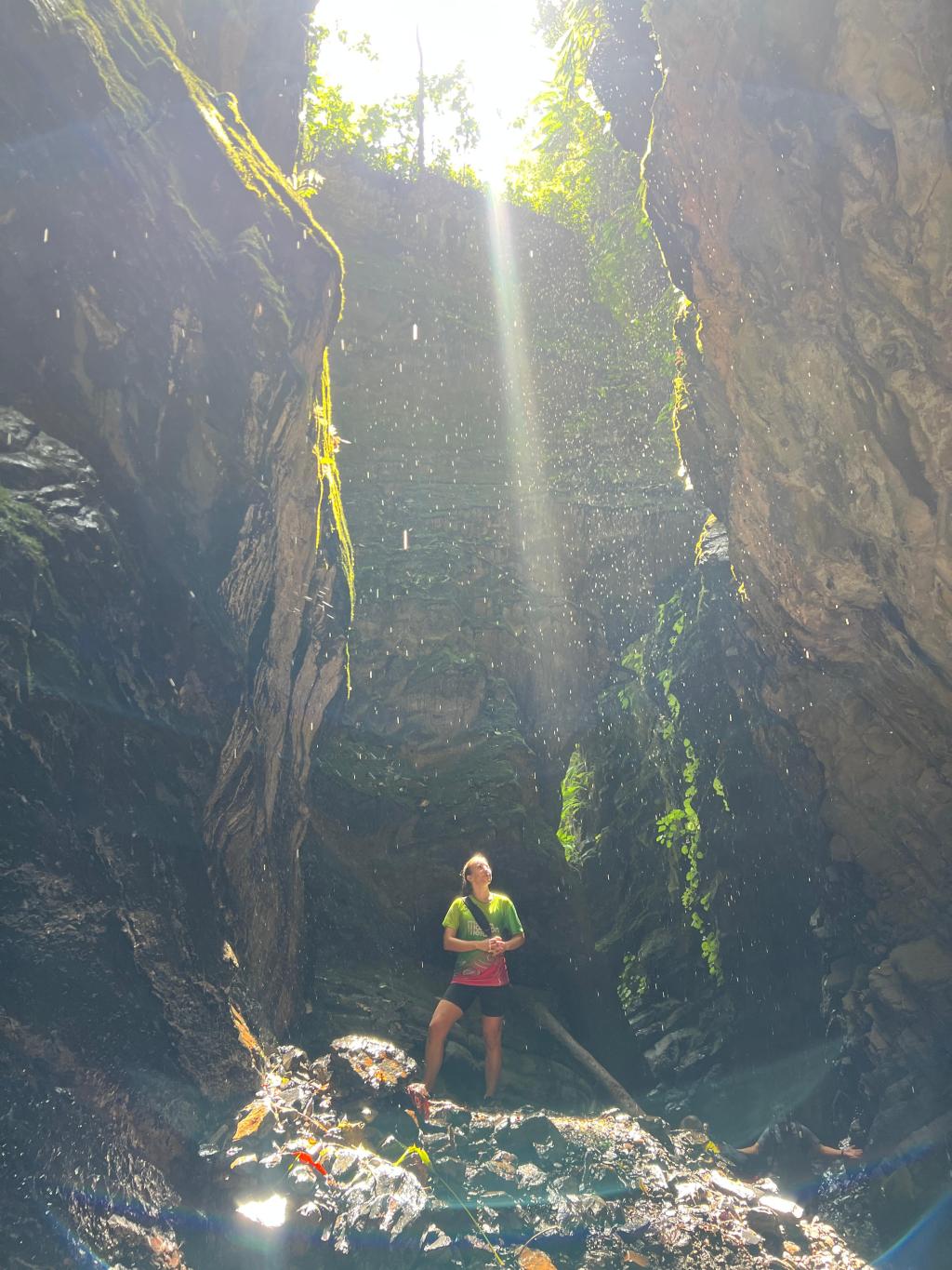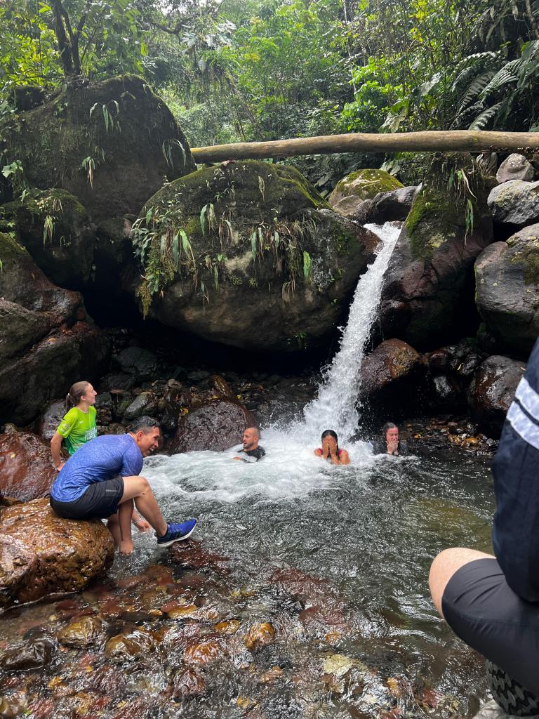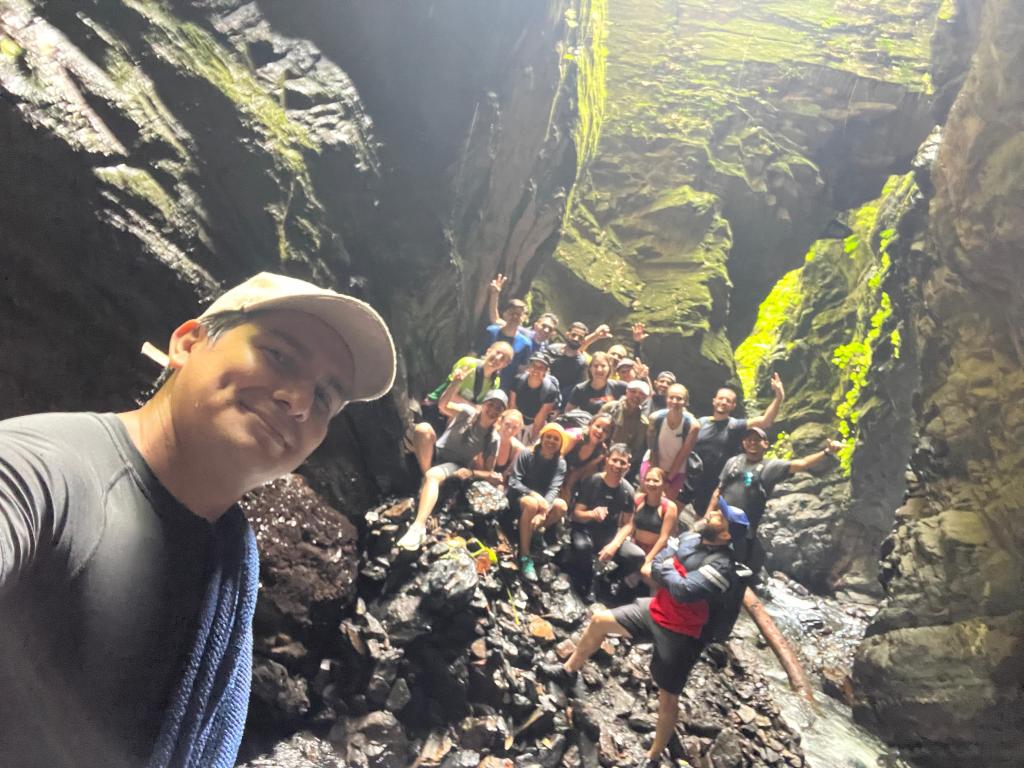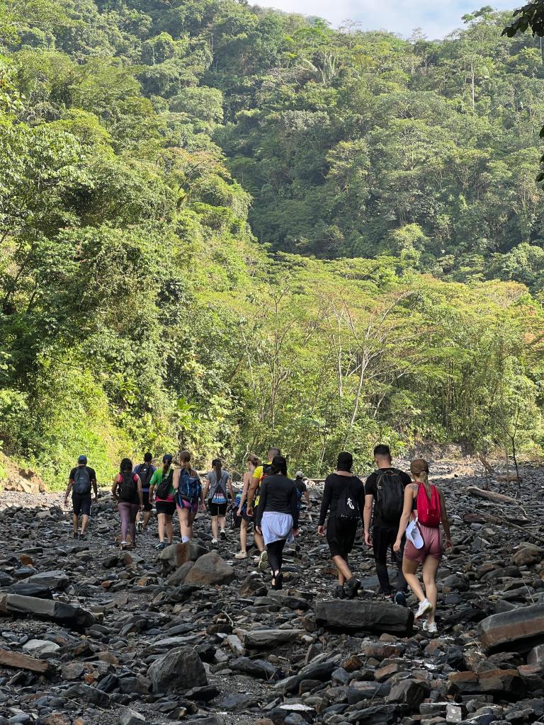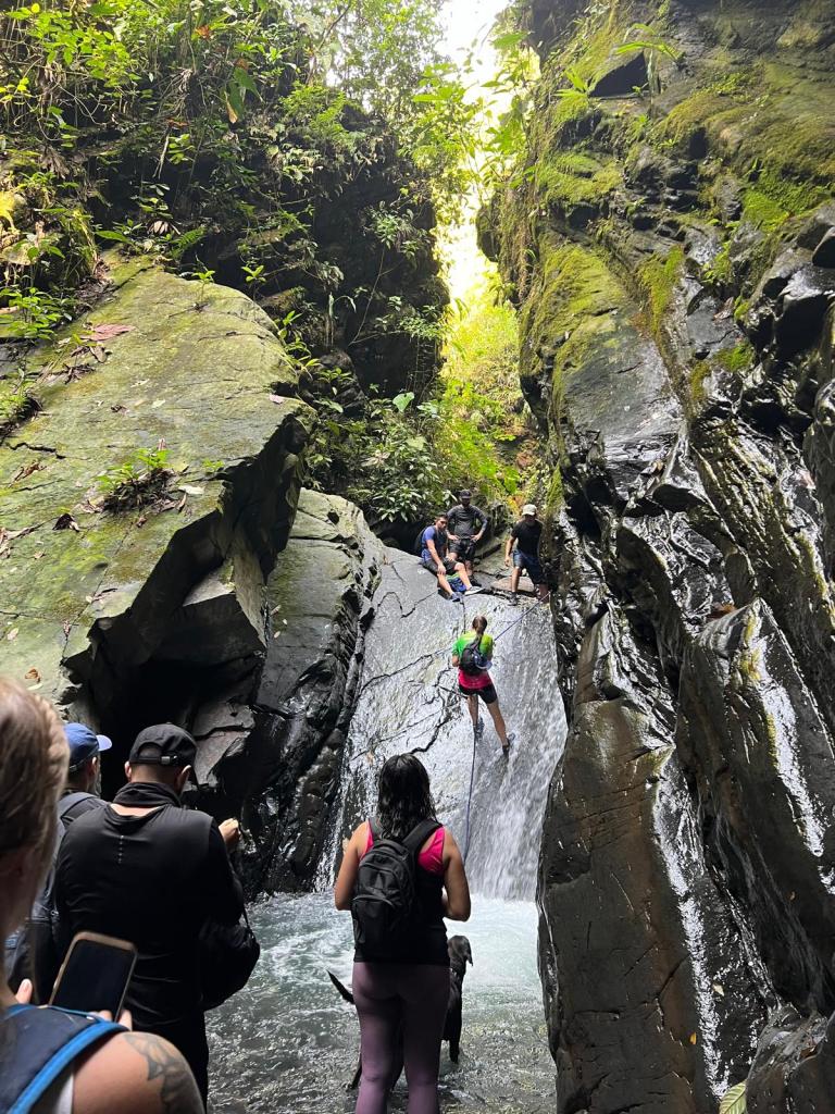 I woke up, post-concert, around 6:00 am and headed right out the door to join a group hike in nearby Restrepo, led by my friend Thanya (organizer of the Planes Juntos Instagram) and our incredible local guide Oscar. We hiked along and through a river, ending up in a narrow part of a canyon called los guácharos after the birds that nest there. Our six-hour trek involved crossing the river repeatedly, climbing over and around many rocks, and using ropes to scale small waterfalls, too!