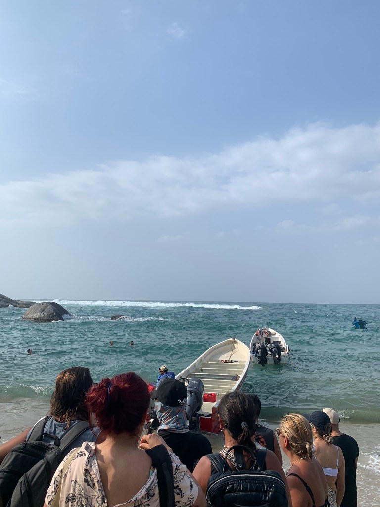 - lancha (large motorboat) in the ocean back to Santa Marta